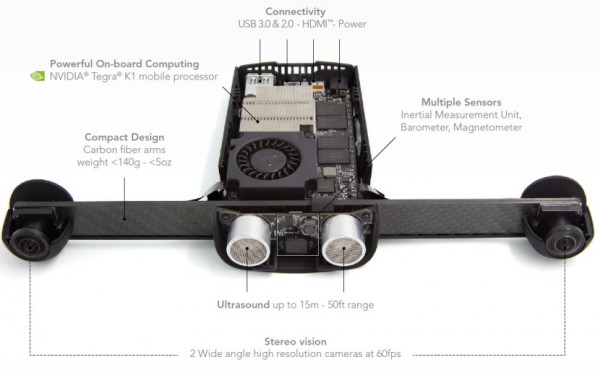 Parrot S.L.A.M.dunk重量为140g,内部搭载NVIDIA Tegra K1新一代移动处理器,能够拍摄60fps视频的1500*1500的鱼眼立体相机,惯性测量单元(IMU),超声波传感器、磁力计和气压计。这款产品计划将于2016年第四季度上市发售。