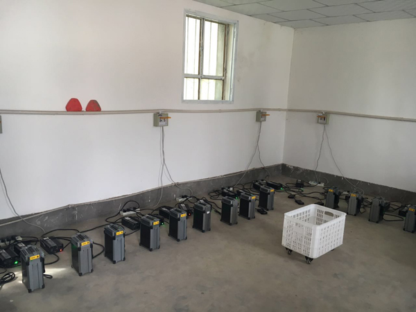 在极飞和硕基地,正在充电的极飞无人机电池。