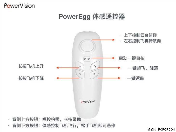 而PowerEgg无人机配备的体感遥控器有点像我们家用的那种游戏手柄,并且还采用了单遥控设计,玩家单手可操控无人机进行起飞、降落、环绕、拍照/录像等。(具体操作可参考按键功能图示 )当玩家手握遥控器同时按下遥感操作按键时,即可通过向前、向后、向左、向右切斜摇杆手柄,来操控无人机的飞行方向,倾斜的角度越大则飞行越快,角度越小则飞行速度越慢,而当用户松开摇杆操控按键式时,无人机则会自动悬停。为了新手的飞行安全,PowerEgg无人机还针对新手飞行做了一定的速度限制。