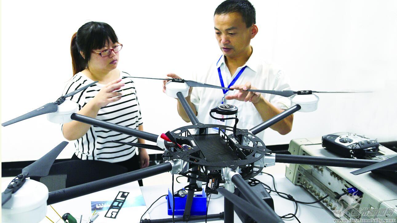 9月12日,在齐河县齐鲁高新技术开发区,齐河京齐智能信息科技有限公司总经理张玉斌(右)在为客户介绍该公司研发的植保无人机。该公司于今年3月份入驻齐鲁高新区中关村海淀园齐河科技城,依托中国农业大学与北京兴汇同维电力科技有限公司的技术支持与人才储备,主要从事无人机、机器人的研发、制造,着重在智能控制及精准农业领域进行拓展。目前,公司已经形成完整的无人机研发、生产、销售链条。