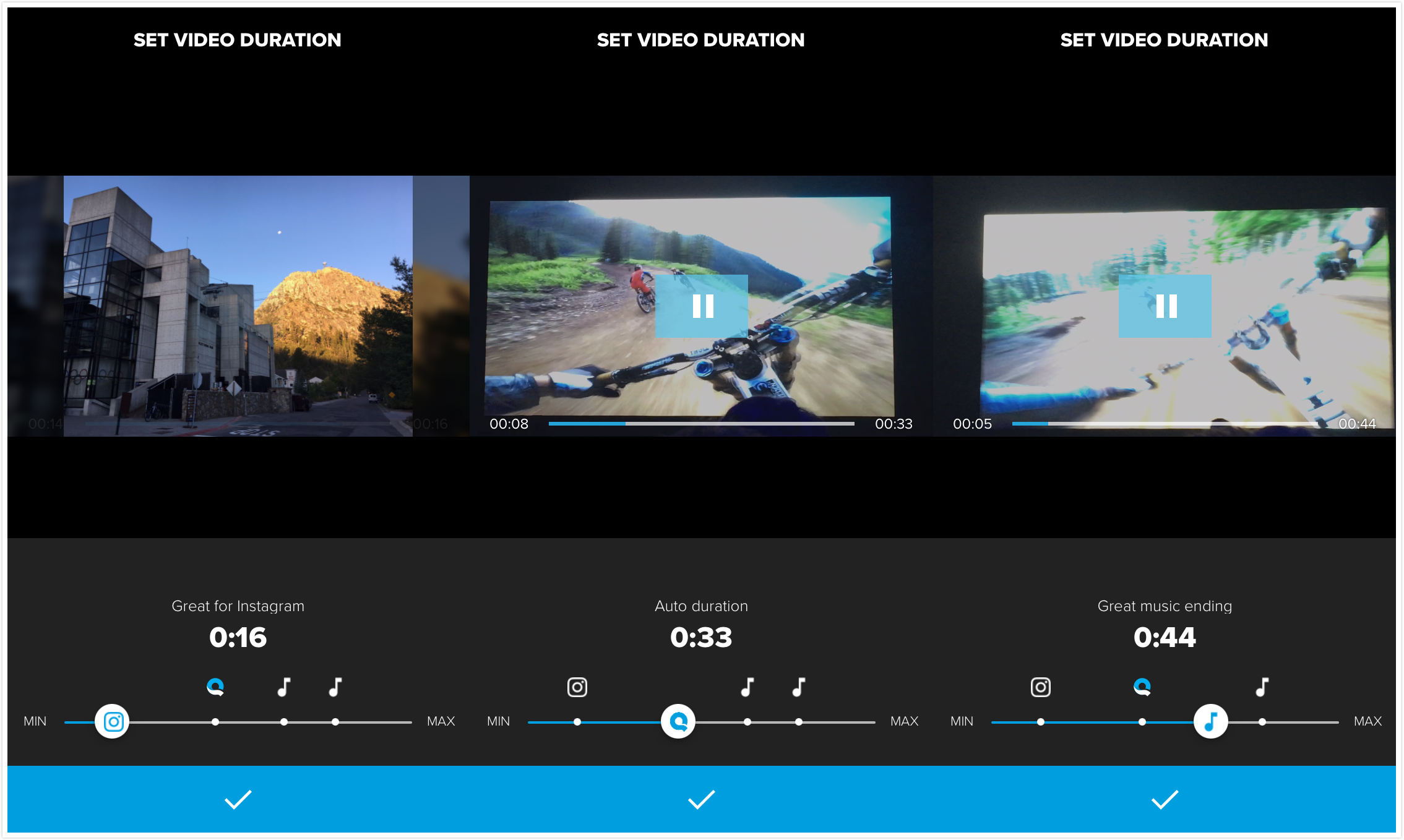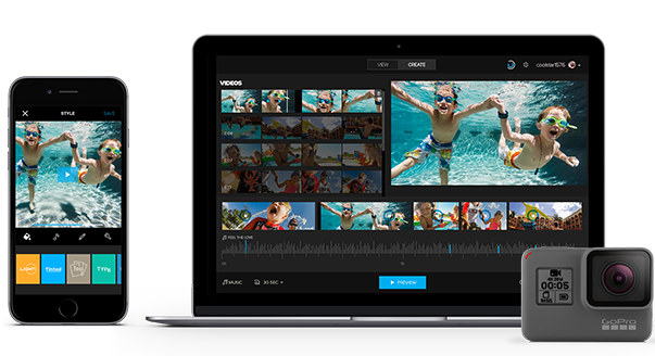 Quik:一个全新的,在PC、Mac、移动端上快速制作短视频的应用。在 Quik 里导入 GoPro 或移动设备拍下的影片,应用会自动把它们拼贴在一起,GoPro 官方还提供了海量背景音乐。Quik 最吸引人之处在于编辑视频本身的过程被极大地简化了,因为在 Quik 里有一个选项,可以让用户根据背景音效和对应的社交网络快速调整视频时长。