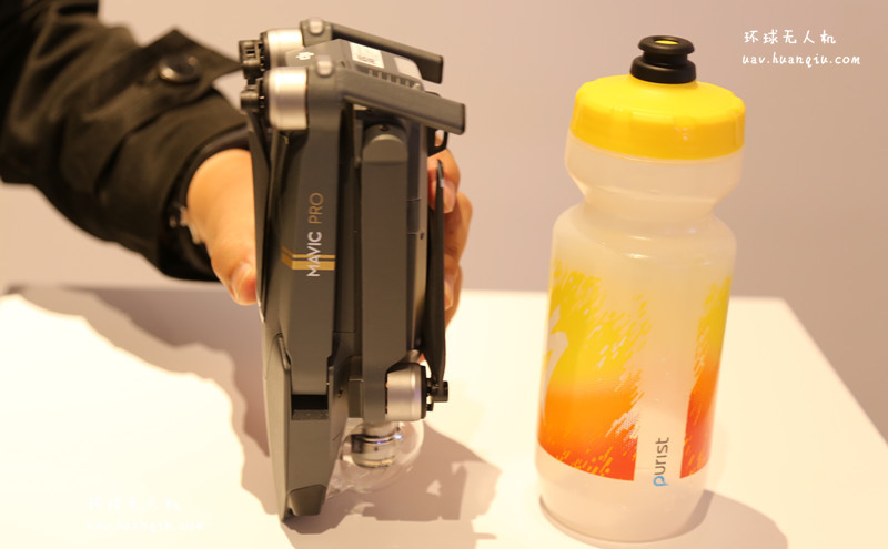 折叠起来的Mavic一头大一头小,较细的那头可以插进背包旁边放水的网兜。装上电池的Mavic重量为734克,略重于一瓶矿泉水。