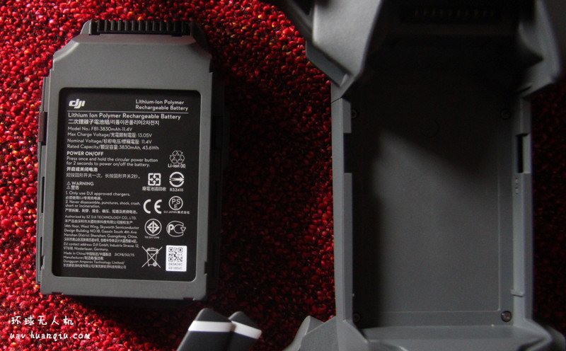 电池为11.4V、3830毫安时,标称续航时间27分钟,实际续航时间敬请期待后续评测。注意供电接口有10个触点,冗余度值得肯定。
