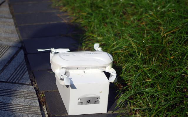 首先把无人机展开,展开尺寸为135mm*145mm*36.8mm。因为附近是草坪,不能放在草坪上面起飞所以我索性就放在包装盒上面准备起飞了。