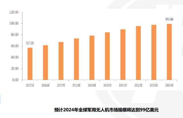 根据美国蒂尔集团的估计,2014年全球无人机市场约为64亿美元,其中军用无人机56.93亿美元,预计到2024年,军用无人机市场规模达99亿美元。英国《简氏情报评论》和中投顾问产业研究中心也看好军用无人机发展。中投顾问产业研究中心指出,未来五年,战斗无人机2020年市场规模将达到30亿美元,年均增速超过70%,战略无人机到2020年达21亿美元。此外,俄罗斯、中国、韩国、印度等无人机市场正在兴起。