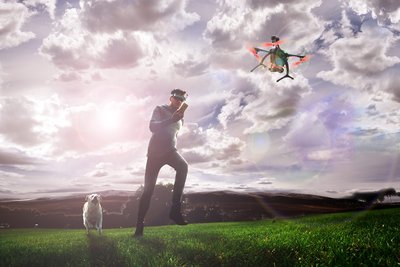 用户佩戴亿航VR眼镜通过“自动跟随”功能体验GHOSTDRONE 2.0智能无人机