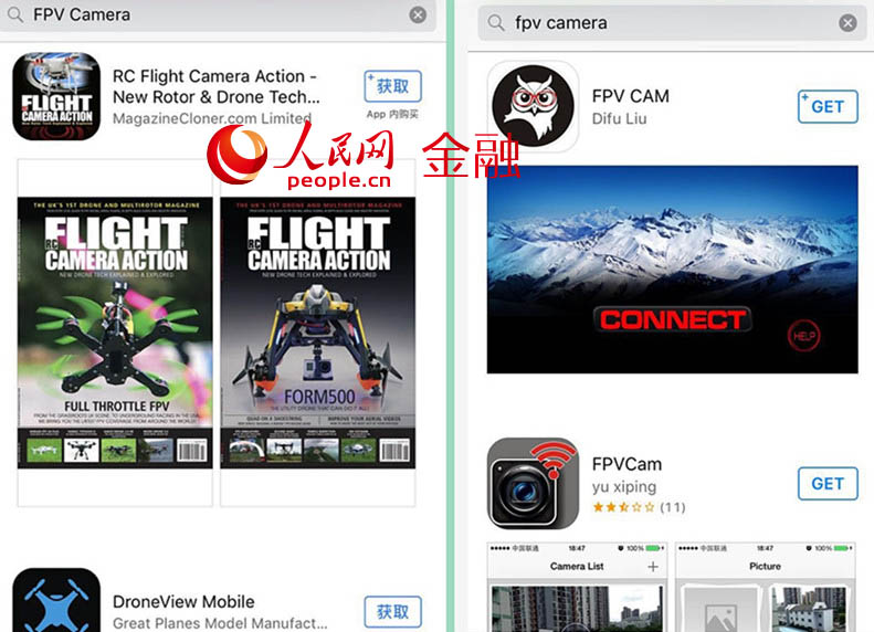人民金融再次搜索“FPV Camera”发现,苹果应用商店中有多款第一人视角操控第三方软件,均为免费使用。