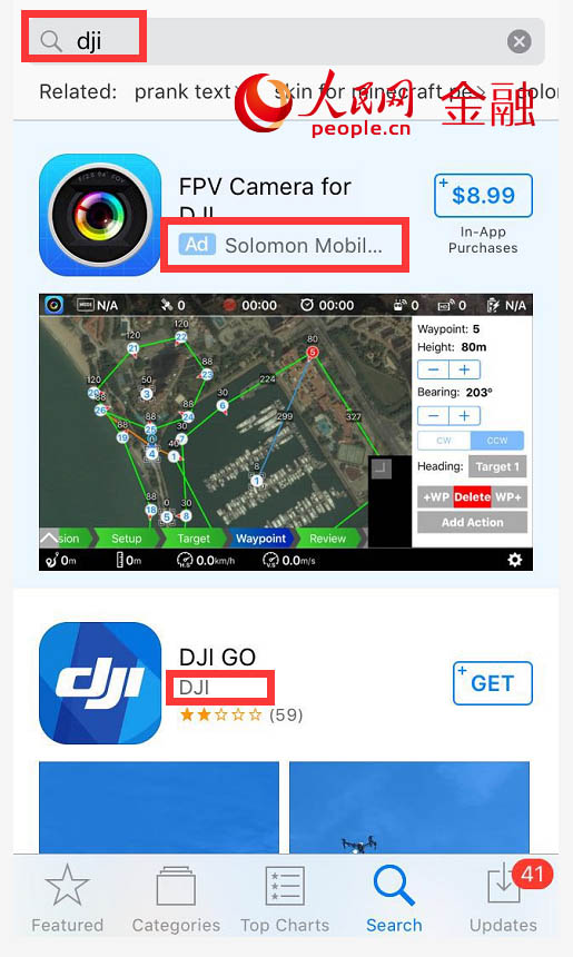 今日,人民金融发现,我们著名无人机公司大疆已“中招”。人民金融搜索大疆创新科技有限公司的英文简称“DJI”,显示置顶的软件并非来自于大疆公司。而是一款名来自Solomon Mobile Technology Ltd.公司,名为“FPV Camera for DJI”的软件,该软件用于帮助用户以第一人视角操控无人机,售价高达60元人民币。