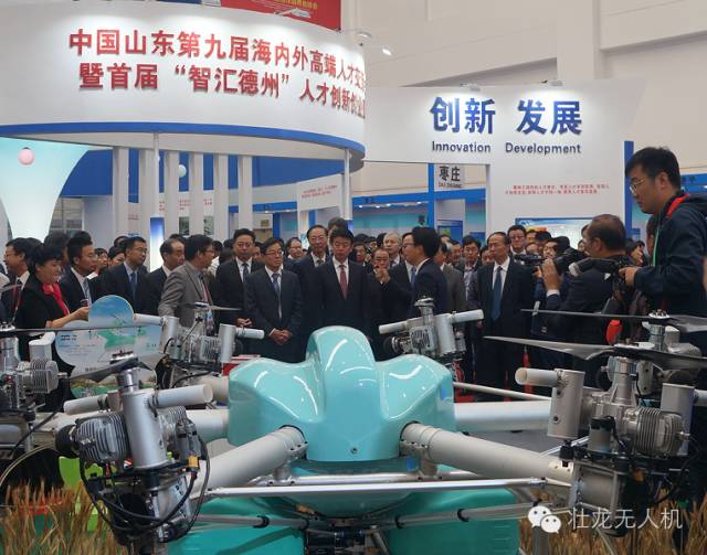 12日上午,人力资源社会保障部副部长、国家外专局局长张建国和山东省委常委、常务副省长孙伟及多位山东省市领导莅临展区参观,对壮龙科技展出的农林植保型无人机“大壮”等产品给予了高度评价。