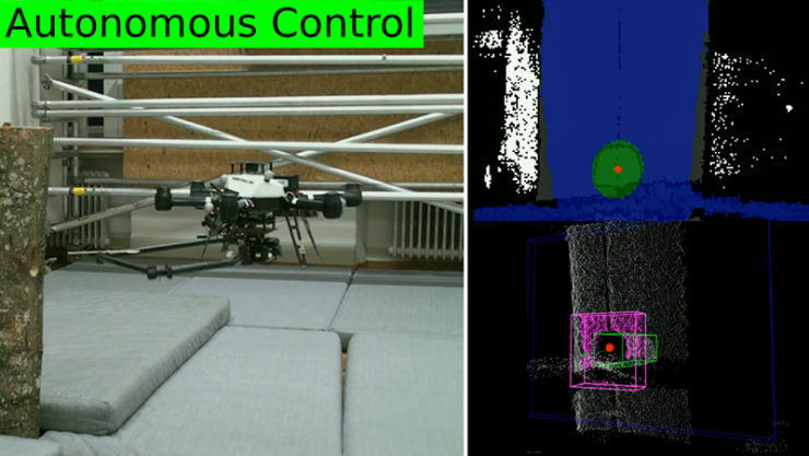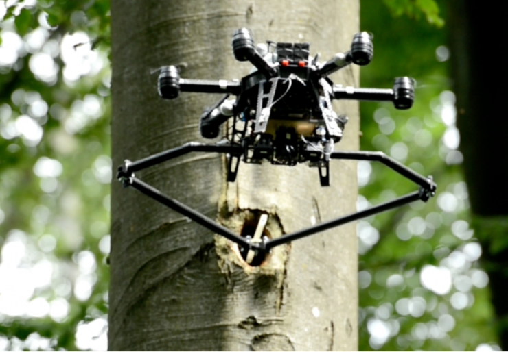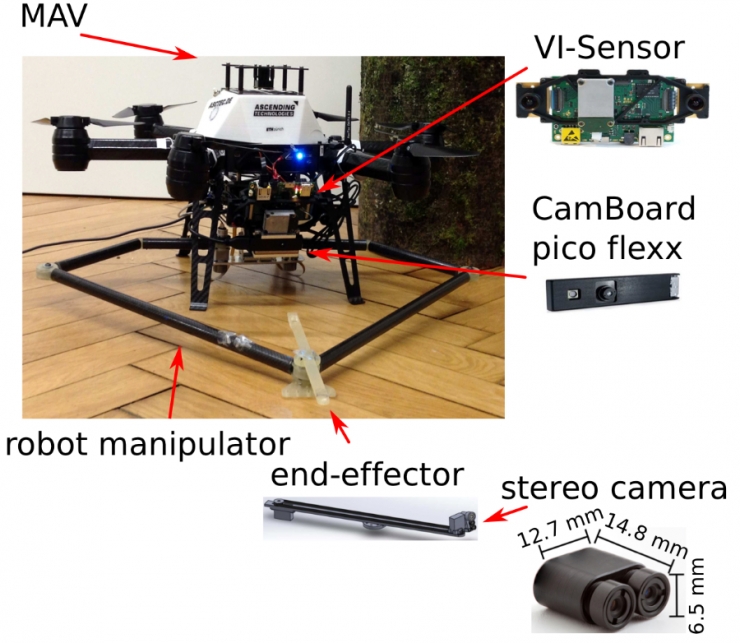 如上图所示所示,ETH 研发的系统基于一个配备了控制器的 Mricro Aerial Vehicle (MAV) ,这样它就可以对这些树洞进行近距离的检查,并且对它们进行3D重构。MAV 身上配备了一个视觉惯性感应器,一个深度摄像机以及一个安装在末端器上的平行的、带有微型立体驱动摄像机的控制器。
