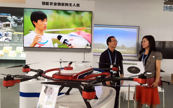 眼前两架农用植保无人机格外醒目,天鹰兄弟工作人员告诉记者,这次他们携带了两架新的无人机参展。获评2016台湾国际工业设计金典奖的第四代物联网全智能农业无人机3DTY-800,搭载天鹰兄弟与美国麻省理工合作研发的人工智能裸眼3D(360度)自主避障控制系统,每小时作业面积可达110-120亩,作业效率是人工喷洒的60-80倍。