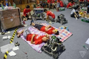 赛场周围的过道成了参赛选手们的临时营地,工程师在这里焊接损坏的零部件,冒起屡屡青烟,还有的就和机器人一起睡在地上,用泡沫塑料当枕头。