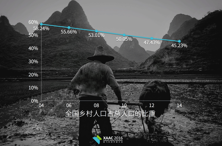 大量的年轻人都从农村走到了城市里,在迁移的过程中有年轻劳动力从农村流失,农村留下的多是老人。目前,中国65岁以上的老人有1.1亿,其中农村老人有6600万,农村是人口逐渐下降、人口老龄化非常严重的地方。到2015年,有30%的土地流转到农村专业种植户、专业农场手里或农庄的手里,他们将成为未来负责农业的主力。