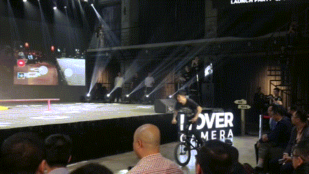 发布会现场,无人机跟拍骑行表演人员,据参数显示,小黑侠的追踪速度可达8m/s,基本上可以保持一定运动范围内(跑步、骑行)的稳定跟随。