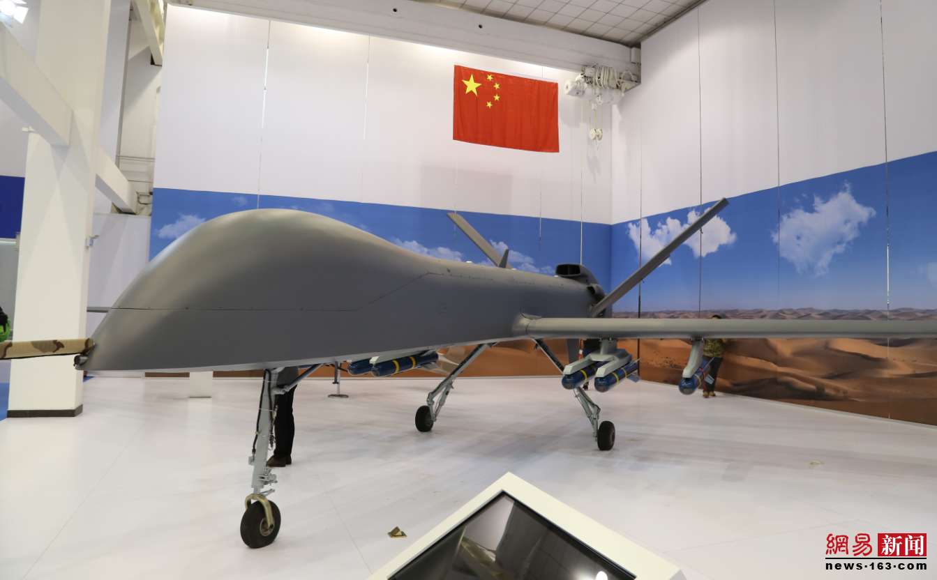 不过,除了模型和实弹之外,展厅里还有多架无人机真机,包括CH-1、CH-3和CH-5,这其中CH-5是中国当前对外公布的最大型的察打一体无人作战飞机,在发布会现场,CH-5无人机的总设计师石文表示,从外形上来看,CH-5应该是CH-4的放大型,,它的长度由后者的9米增加到12米,翼展由18米增加到20米,最大起飞重量由1300公斤增加到3000公斤,作业高度由7000米增加到9000米,这些指标已经与美国的MQ-9无人机基本一致。