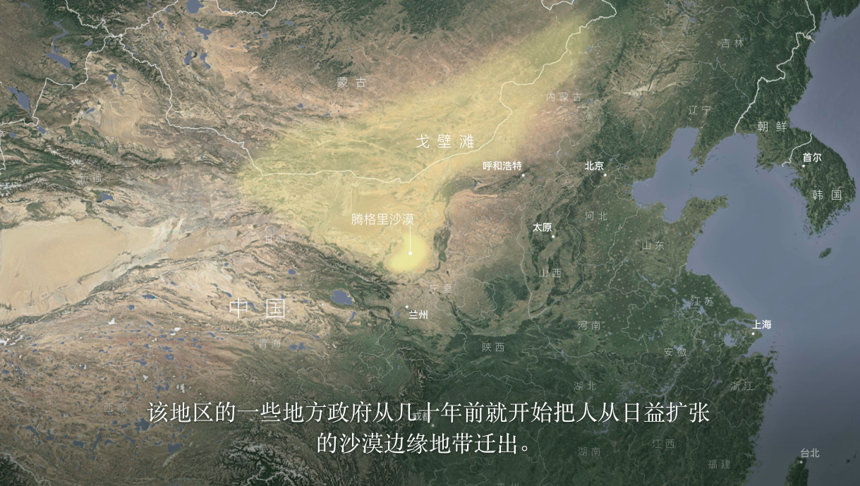 这组互动数字报导名为《生活在中国庞大的沙海》,记录了腾格里沙漠这些年来的高速扩张,而且面积还在一天大似一天。我们还知道了很多从未关注过的数字。 数年来,中国境内的沙漠面积以每年超过1350平方英里的速度增长,许多村落因此消失。