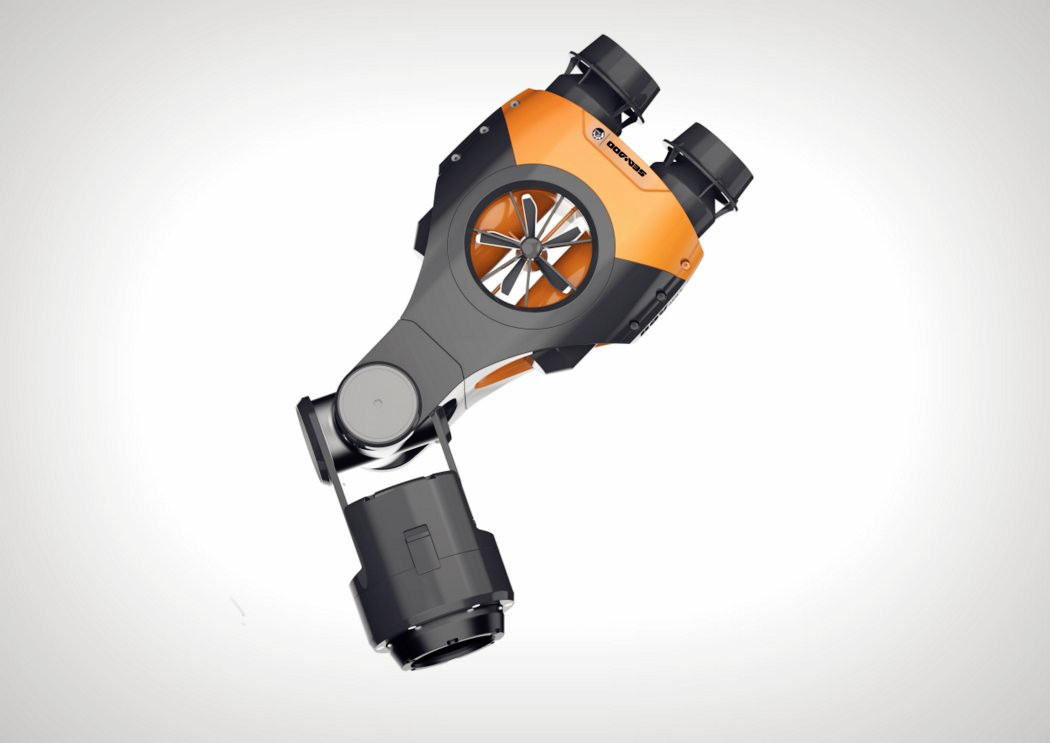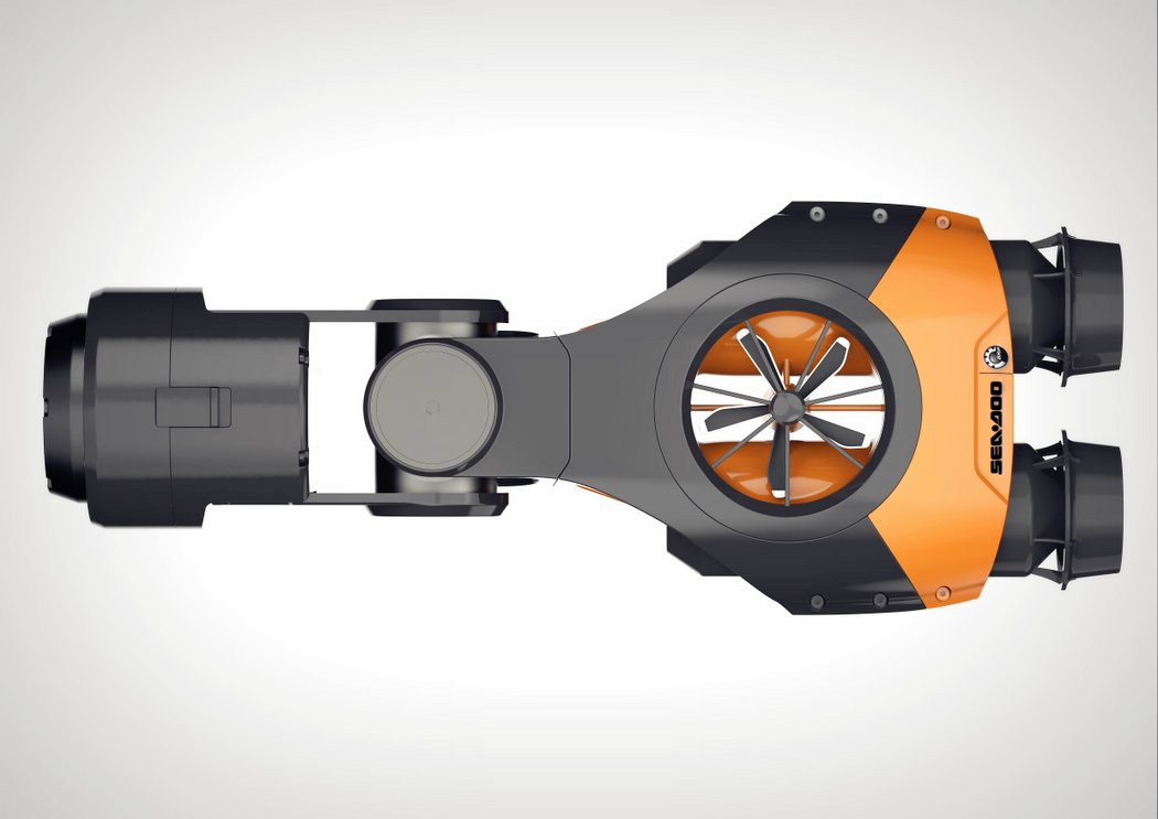 水下无人机的尾部两个螺旋桨可以提供超强动力,并且左右输出动力不同从而可以转弯等动作。