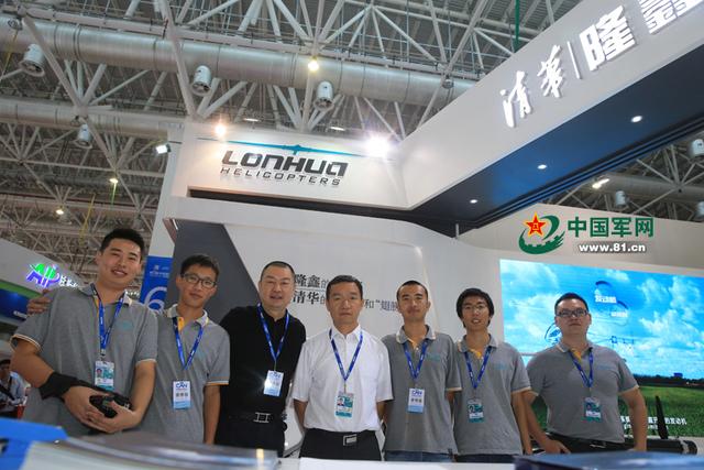 2016珠海第十一届国际航空航天博览会上,隆鑫通用动力股份有限公司董事长高勇(左三)与隆华无人机总设计师王浩文教授(左四)及设计师们合影。