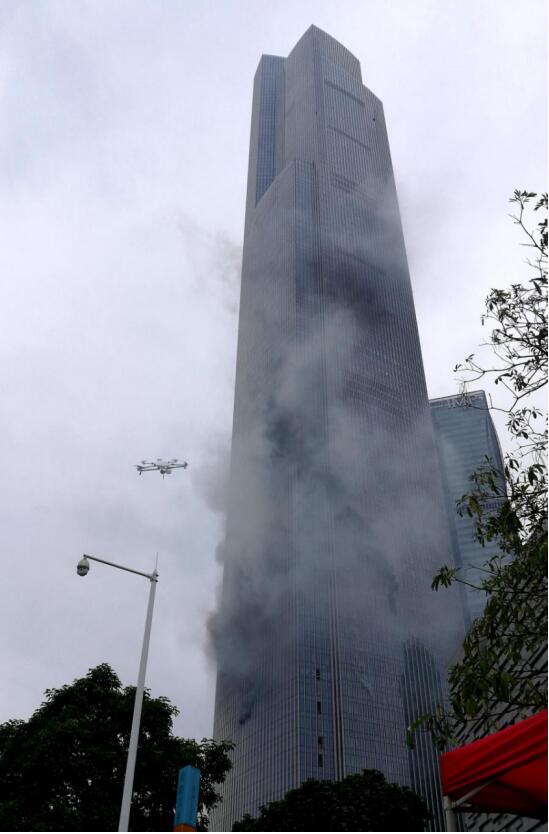 9日上午10点30分,广州周大福国际金融中心(东塔)消防演练无疑是夺人眼球的重头戏。广州东塔是广州又一地标性建筑,记者从演练现场看到,东塔主塔楼17楼有滚黑烟从大楼直喷窗外,大量浓烟蔓延,消防官兵正在组织多名“被困”群众疏散。此次演练不仅是对广东消防部队高层灭火救援专业队实战能力的一次检验,更是对建筑消防设施、消防电梯应用、通信保障等诸多课题和研究成果的一次“实打实”的运用。而且在此次消防演练中,第一次使用无人机空中助阵,智璟科技无人机T60的高速实时图传功能和高清的航拍效果为消防现场与广场观众做了一次很好的实时互动。