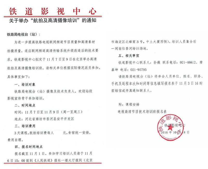 本次培训活动由中国铁道总公司影视中心组织主办,参加单位有:铁道影视中心、武汉局电视台、郑州局电视台、西安局电视台、哈尔滨局电视台、呼和浩特局电视台、南昌局电视台、兰州局电视台、南宁局电视台、昆明局电视台、沈阳局电视台、大同湖东电力机务段、成都局成都公务大修段、成都站、呼和浩特集通铁路集团公司、太铁传媒中心,等18个路局单位成员代表;成员上至路局电视台副台长,下至驻站党委干事、党群办干事、主任、科长、工程师、技术员、操作工、记者,甚至车号员,可以说是铁路系统组织的一次较大规模培训学习活动,无人机应用技术的重要性由此可见一斑。