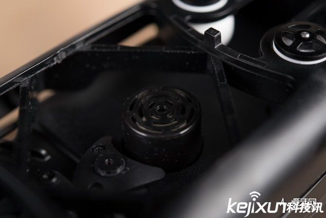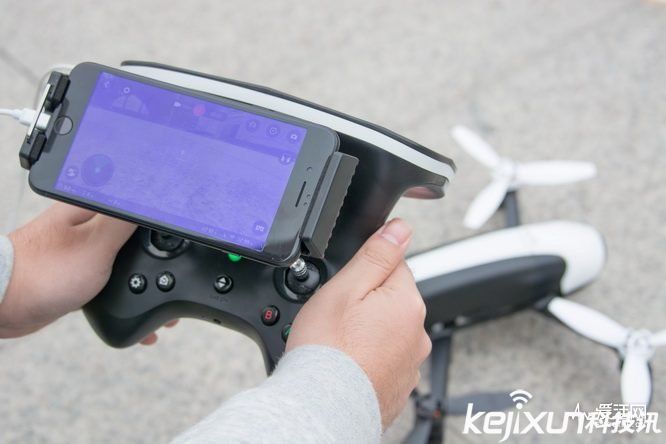 不过这款SKYCONTROLLER 2手柄并未搭载显示屏,而在手柄中心位置搭载有一个手机支架接口,如果需要观察无人机视角的话,可以将手机与手柄进行连接后,通过支架搭载在手柄上方。但是手机夹板为单侧活扣设计,所以在夹入较大尺寸的手机后,手机将不会处于手柄正中心位置,而会偏向于夹板活扣的一侧。而且虽然支架可以小角度前倾,但如果想要获得较好的观察角度,手机就不可避免的会遮挡下方的按键,虽然不会造成很大的影响,但总有种逼死强迫症的感觉,看来手柄的设计团队中缺少一名处女座。