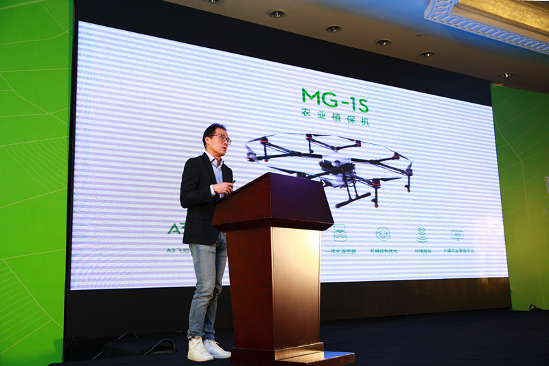 MG-1S植保无人机发布现场,大疆创新农机销售总监曹楠做产品介绍。