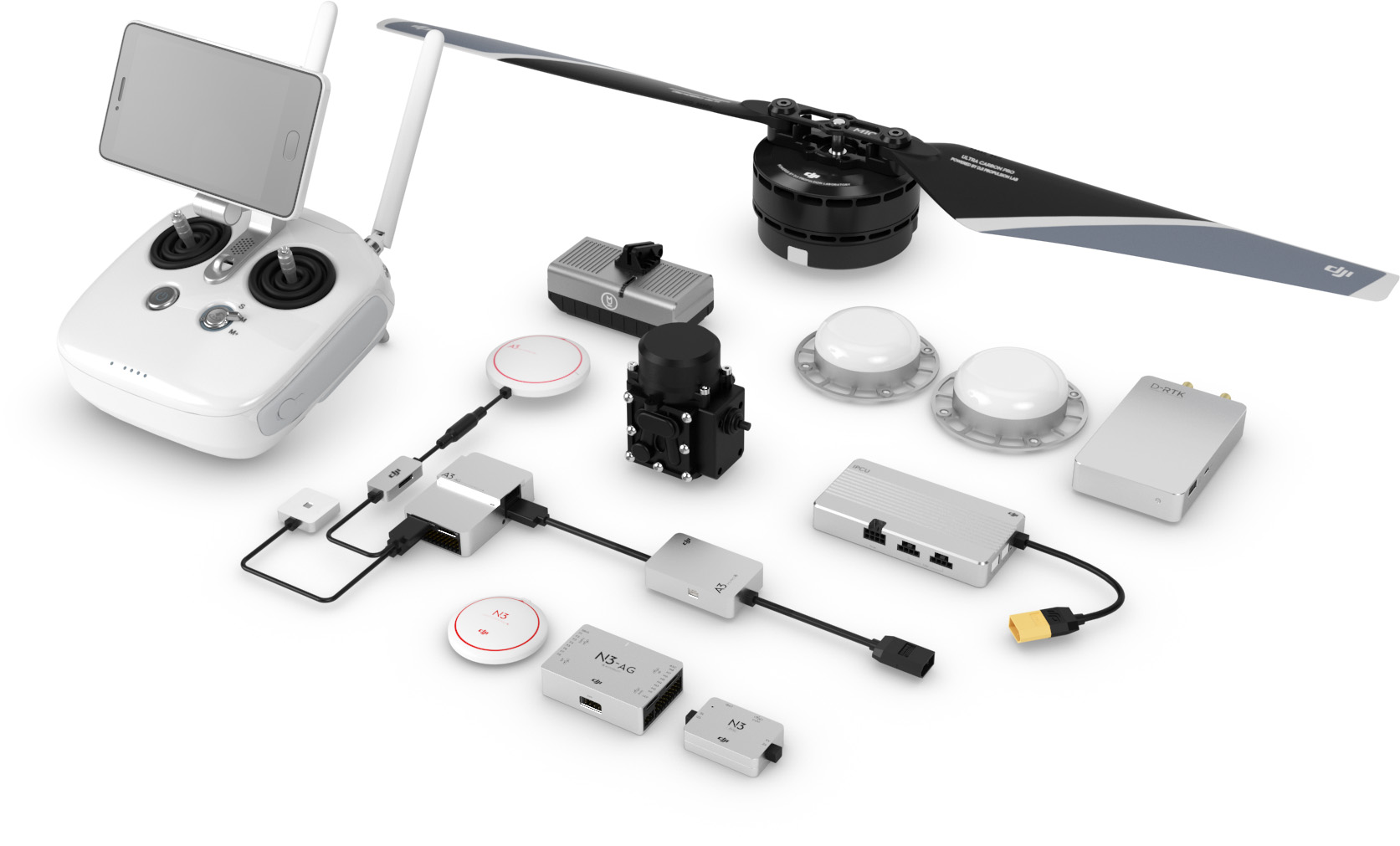 发布会现场,大疆还推2套出面向企业市场的农业产品套装。此套“农业植保解决方案”专为农业无人机生产企业设计,提供从飞控到动力系统的全套解决方案。该套装包含A3-AG/N3-AG植保定制版飞行控制系统、农业管理单元(AMU)、调频连续波雷达、RTK、定制行业遥控器、E5000多旋翼动力系统、作业管理平台与农业APP。在该套装的基础上,农业无人机生产商可以迅速搭建自己的飞行平台,设计针对不同环境的植保无人机。