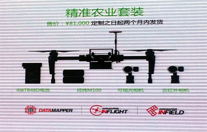 第2套为“精准农业套装”由大疆与美国最大的农业数据分析提供商之一PrecisionHawk合作推出,包含大疆M100开发者平台、一个可见光相机与一个近红外相机。利用该套装,用户可针对精准农业的应用场景进行定制化开发,开展成本优化、产量评估、快速植保、高速巡查等工作。