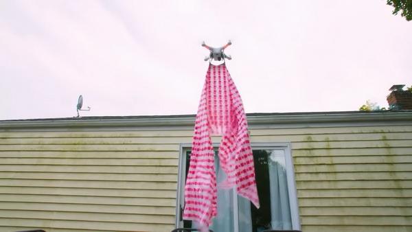 整个操作的关键其实就是在无人机的“脚”和桌布之间贴上一块胶带,不过即便是这样,无人机的第一次尝试也依然未成功。