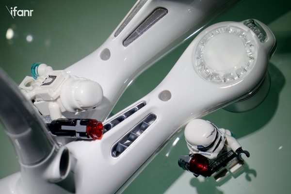 从前方看起来好像是跟 Phantom 4 一个模样,但拼在一起看(上图),会发现 Phantom 4 Pro 的双目摄像镜头位置降低了。