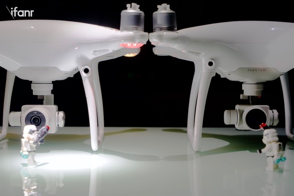 左方是 Phantom 4,右方是 Phantom 4 Pro(上图)。Phantom 4 的电池容量为 5350mAh,而 Phantom 4 Pro 的电池为 5870 mAh。不过,大疆官方表示两者可以共用。