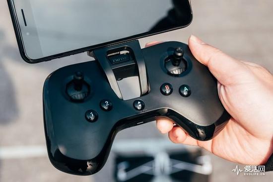 手机仅有的20m的控制半径并不能让人尽兴,在Parrot Swing随机套件中还包括了一个Parrot Flypad控制器,当手机与无人机完成连接之后,按下遥控器正中央的Parrot Logo,即可启动Flypad并与无人机完成连接,与此同时Parrot Swing的控制半径增加到了60m。
