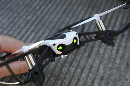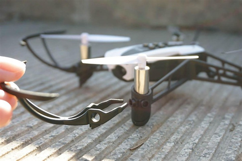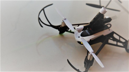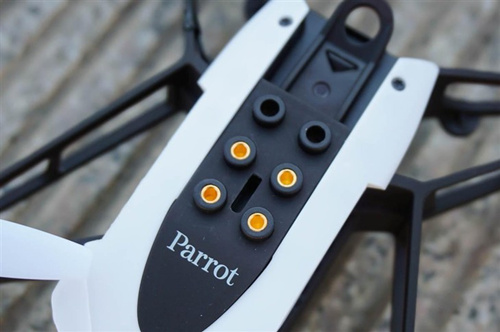 Parrot Mambo从外观上来看和其他的四轴无人机没什么不同。整体来看体型较细小,重量只有63g。整体颜色以黑、白为主,前面两个螺旋桨片为白色,后面两个为黑色,方便在空中辨认前后,螺旋桨的外防护圈可以拆卸。机身下面有开关键和像素为30万德摄像头,说实话没啥用。机身上有六个卡位可以装置六粒BB弹,同时它还附送BB弹枪配件Cannon和一个机械臂Grabber,加装上去就可以将无人机变身为战斗机了。