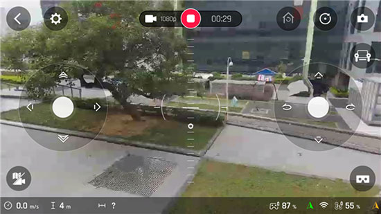 FreeFlight PRO可以实现两大功能,一是画面传输和1080P的视频录制,二是充当一个虚拟操控面板,实现与手柄一样的操控功能。前者很好理解就不赘述太多了;关于虚拟操控,我们最关心的还是操控是否有延迟,在实际体验中这一点完全不必担心,在使用体验上除了触感不同之外,其他的功能使用与实体手柄并无太大区别,其界面和功能按键设计还是非常简单合理的,虚拟摇杆的使用流畅自如,指令反馈精确,不过要说哪种操控体验最带感,那当然还是触感实在的实体手柄。