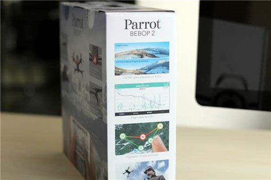 Parrot BEBOP2的包装简单明了,在包装盒的四周标明了产品的特性和参数,比如提供了1400万像素广角摄像头、跟踪飞行、25分钟续航时间等等。Parrot BEBOP2采用了时尚科技感突出的设计,机身整体采用黑白相间的配色,不仅看起来养眼,而且飞行时也更易于与周遭环境区分开来,方便用户辨识。