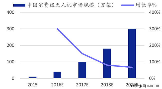 消费级无人机近年来销量高速增长,产业开始崛起。全球市场需求旺盛,数据显示,2013-2015年全球消费级无人机规模从14.95元亿增长至110.5亿元,销量从60万台增长至430万台,年均复合增速分别为171.87%、167.71%。国内市场销售火爆,据IDC数据显示,15年国内无人机销售量近10万台,市场规模近3亿元,16年预计达到39万台,到2019年销量将突破300万台。