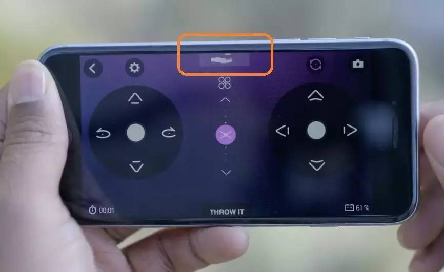 按下 FreeFlight Mini 应用界面上方的“抛飞”键,再把 Parrot Swing 轻轻往上一抛: