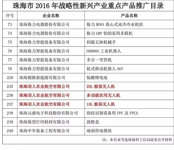 据悉《珠海市2016年战略性新兴产业重点产品推广目录》在珠海市科工信局网站自12月16─20日有5天公示期。今天正式对外发布,珠海羽人农业航空有限公司的20L植保无人机、多功能农用无人机、10L植保无人机系列产品荣登《目录》。此次入选的《目录》的厂家和产品经过严格的审查和评选,羽人产品能入选充分说明了专家评委对我司产品极大的肯定。同时也为羽人2017年的发展增添了更大的信心。