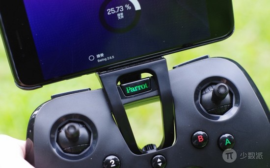 Swing 的遥控手柄叫 Flypad (也可以控制 Parrot 其它无人机产品) ,和 Parrot 其他产品用手机应用遥控不同,Swing 配备 Flypad 的原因是:它的卖点是速度——在 8 米每秒的竞速模式下,用手机操控简直就是自虐。