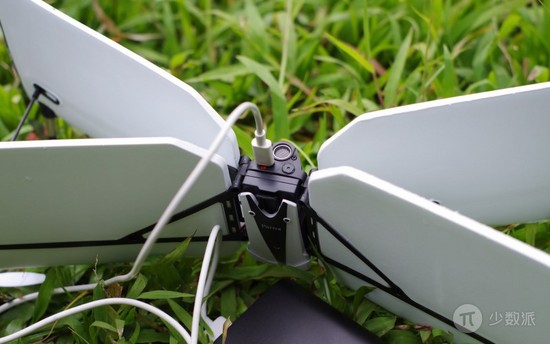 Swing 的中文名为「速影」,它的外观设计非常抢眼,摆出一副猛禽怪兽的姿态。泡沫材质的机翼和塑料骨架,重量控制在 300 克之内。这样的材质搭配,更多是出于安全考虑,包括近万元的 Parrot Disco 也是如此。当然,所有配件都可以在官方商城里单独购买和替换。不过,由于这个外形和材质,不大适合携带,如果随意放在背包里,总是担心会把它压坏,只能用柔软宽松的布袋。