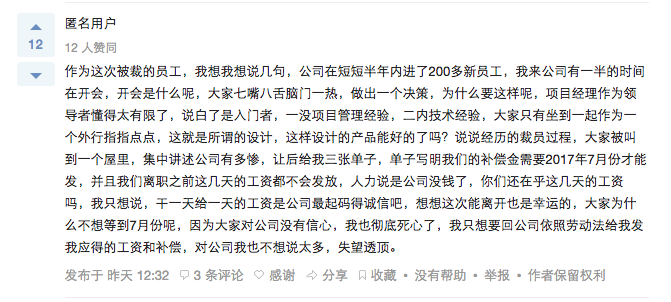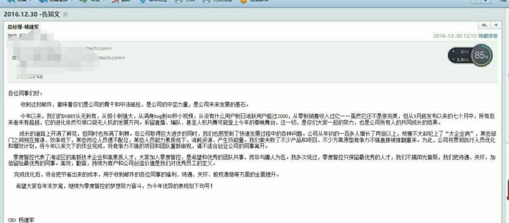 “刚刚还在上班的Loddie女士(化名)昨夜还在加班,今早抵达公司已经发现变天了。所有人的电脑被公司收了起来。这是瞬间被离职的前兆。”看起来像小说一样的场景,却是零度智控内部真实的情况。2016年12月30日,零度智控被曝裁员一百余人,并且速度非常快,“上个厕所回来办公室就没人了”。知乎上有人透露,员工补偿也不到n+1,还是2017年7月份才给。
