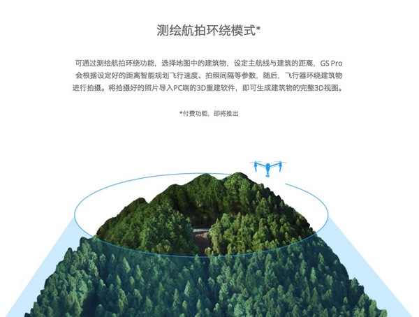 测绘航拍环绕模式允许飞机在选择建筑物作为对象后,围绕目标保持固定的距离环绕拍摄建筑物,并拍摄照片供 3D 建模使用。这一模式将作为付费功能稍后推出。