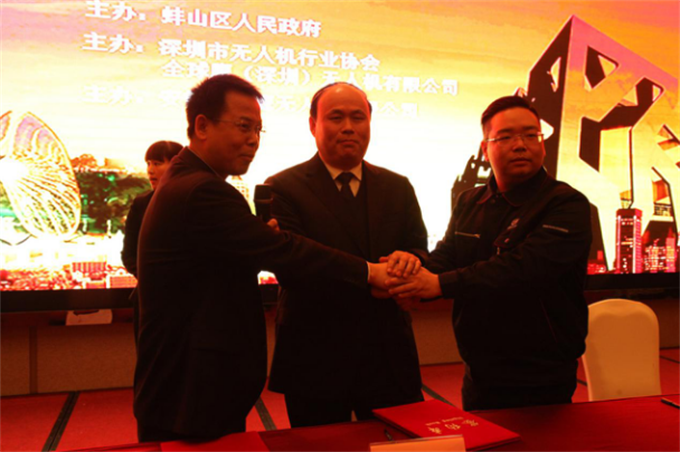 在下午的活动现场,全球鹰现场签约农业植保无人机订单100架,销售额近千万元!同时,全球鹰还联合中航工业631所及蚌埠市蚌山区政府三方签约,规划在蚌埠市联合打造中航工业(蚌埠)全球鹰无人机产业园,未来将形成完整的工业级无人机产业链。