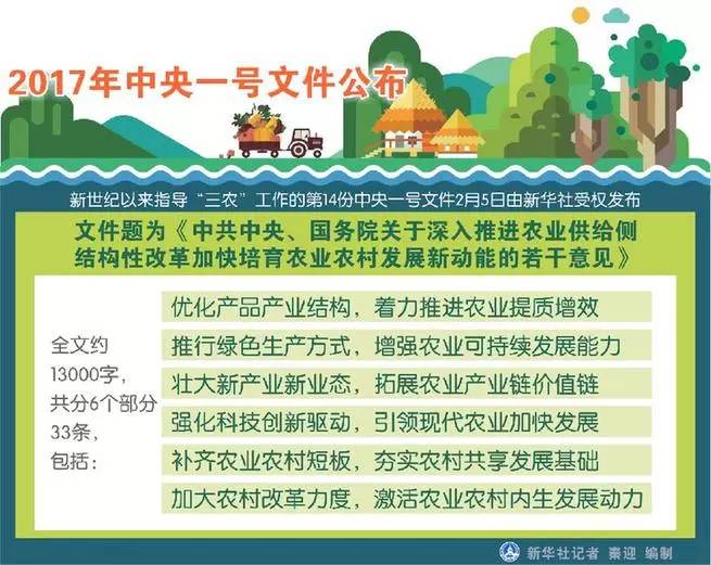 这份文件题为《中共中央、国务院关于深入推进农业供给侧结构性改革加快培育农业农村发展新动能的若干意见》,全文约13000字,共分6个部分33条,包括:优化产品产业结构,着力推进农业提质增效;推行绿色生产方式,增强农业可持续发展能力;壮大新产业新业态,拓展农业产业链价值链;强化科技创新驱动,引领现代农业加快发展;补齐农业农村短板,夯实农村共享发展基础;加大农村改革力度,激活农业农村内生发展动力。