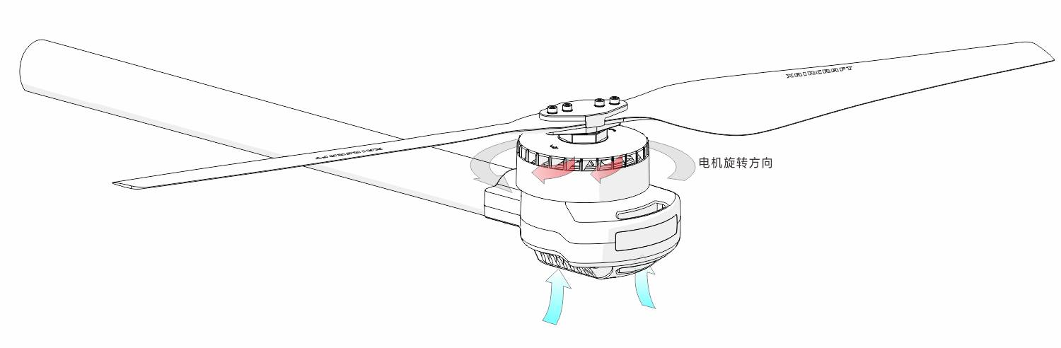 由于电机转子保护壳是随螺旋桨一起旋转的,我们便想到把它做成一个涡轮风扇,在电机工作的时候,这个涡轮扇能够把电机保护壳舱内的热气抽到保护壳舱外,从而达到散热效果。所以我们可以看到,P20 电机固定保护壳底部会有进气槽,旋转保护壳内上方会有涡轮扇叶,确保电机温度正常,实现高效运转。