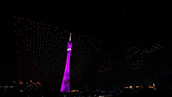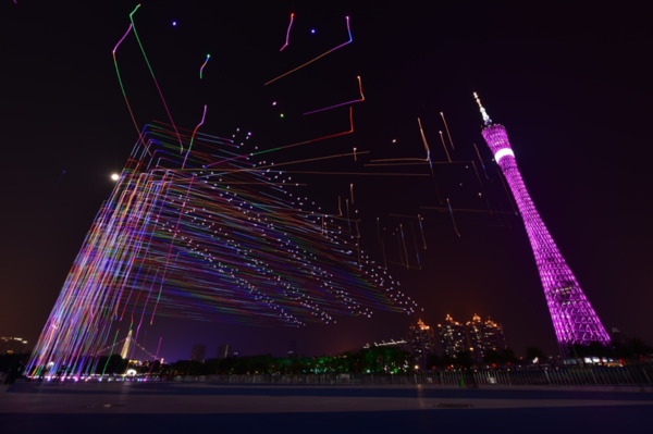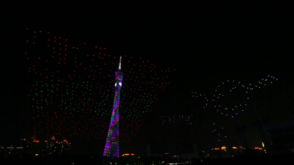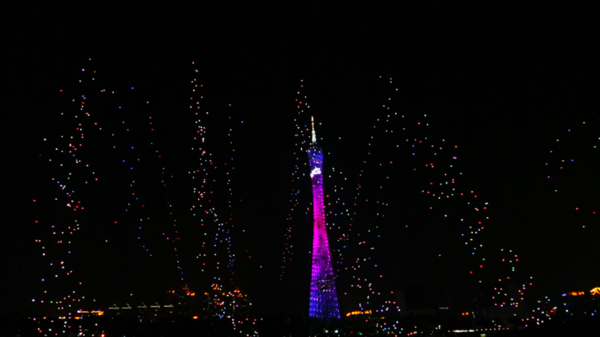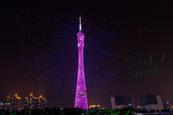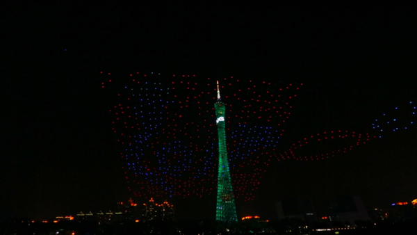 (图注:亿航1000架无人机编队形成的“天幕流星”,与小蛮腰广州塔和珠江夜景交相辉映)