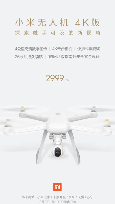 小米无人机4K版今日正式发布,售价2999元,将于3月3日在小米商城、小米之家、及其他电商平台正式开售。