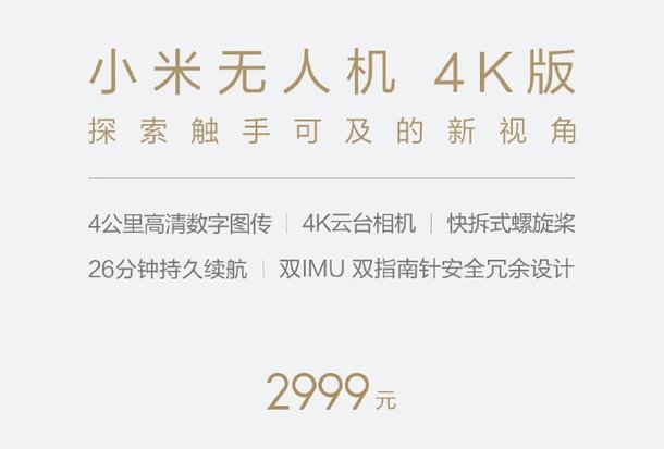 小米无人机售价2999元,电池是499元,在小米商城、小米之家、米家商城、天猫小米官方旗舰店、京东商城、苏宁等平台均有售。