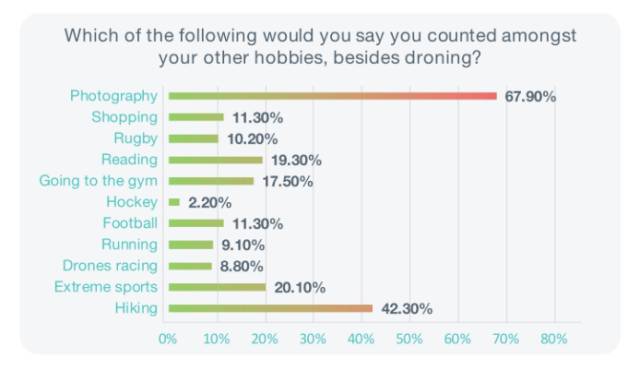 而且,绝大多数无人机用户的兴趣爱好是摄影(67.9%),而不是电子游戏或电影。