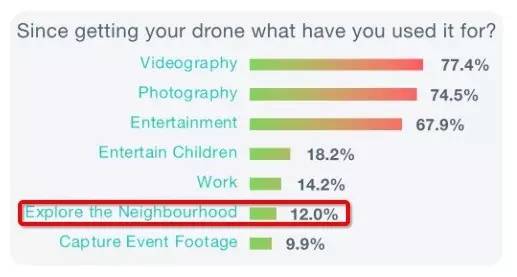 在无人机用途中,摄像和拍照理所当然的成为了首选,分别占77%和74%,然而细心的臻迪君发现了另一条信息:12%的用户会使用无人机来了解邻居……画面感着实有点强,只是这样做,真的不怕警察叔叔叫去喝茶吗?